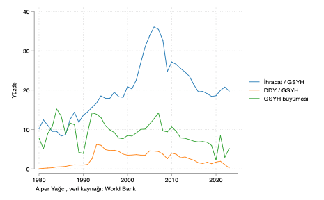 Şekil 3: Çin’de büyüme, doğrudan yabancı yatırımlar ve ihracat (1980-2023)